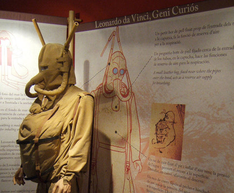 Additional drawings show a complete diving suit, equipped with some sort of mask, with a box containing air. Da Vinci even included the provision for a urine collector into his design. He also famously made designs for an “Underwater Army” diving suit with bamboo pipes, a sheepskin suit, and a bell-shaped air-trap.