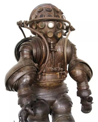 This system used a rubber mask connected to a rubber airbag, a copper oxygen tank, and a scrubber for removing CO2, so the exhaled air could be re-breathed. This device was initially developed to save trapped miners, but it was immediately recognized for its underwater potential. While it did limit the divers working depth due to the danger of oxygen toxicity, it was a revolutionary design. From the late 1800s and throughout most of the 20th century, most standard diving dresses were made from a sheet of solid rubber laminated between layers of tan twill.